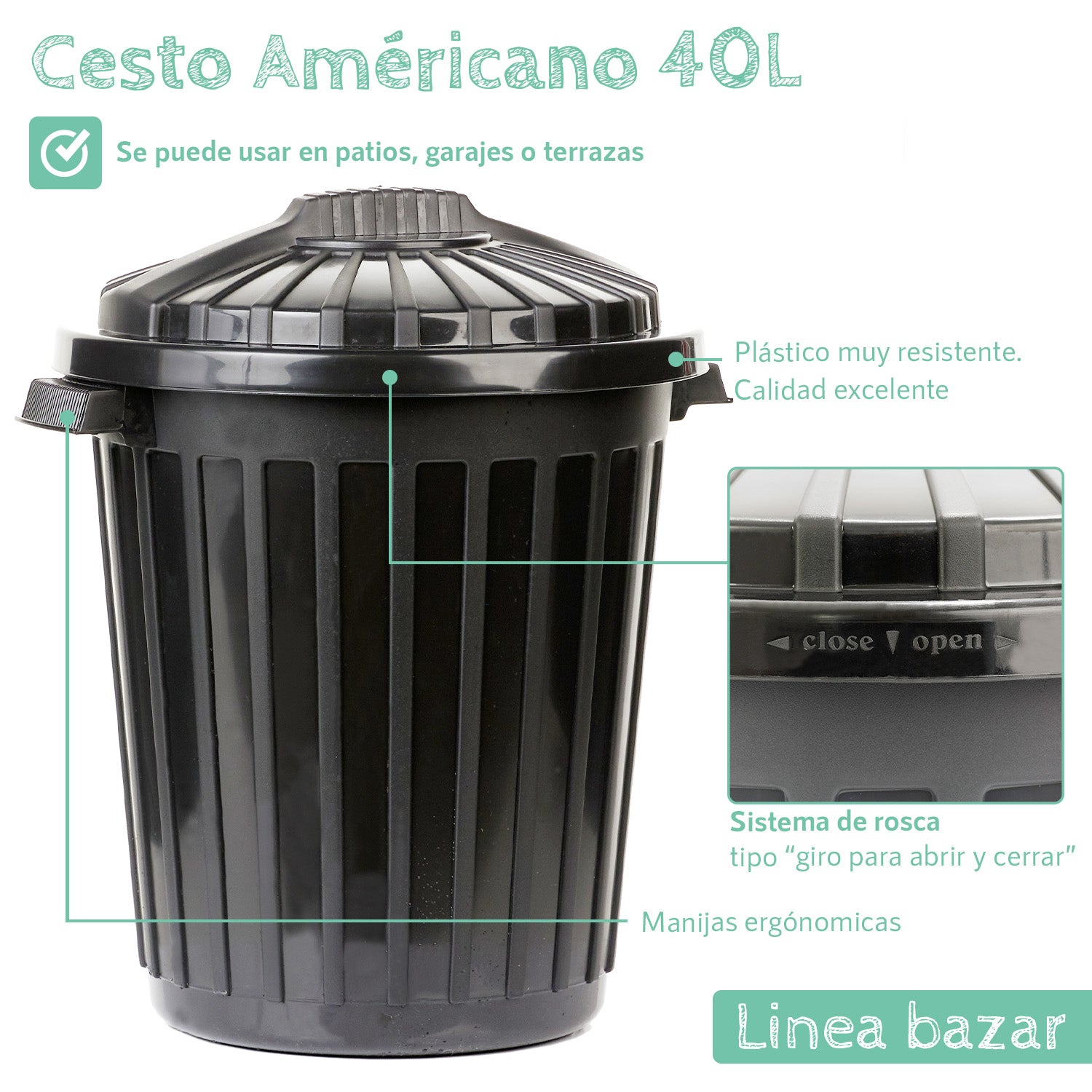 Cesto de Residuos Americano de 40 litros, práctico y resistente para el uso diario. Su diseño funcional y amplia capacidad lo hacen ideal para cocinas, oficinas o espacios comunes. Fabricado con materiales duraderos, ofrece higiene y fácil limpieza.