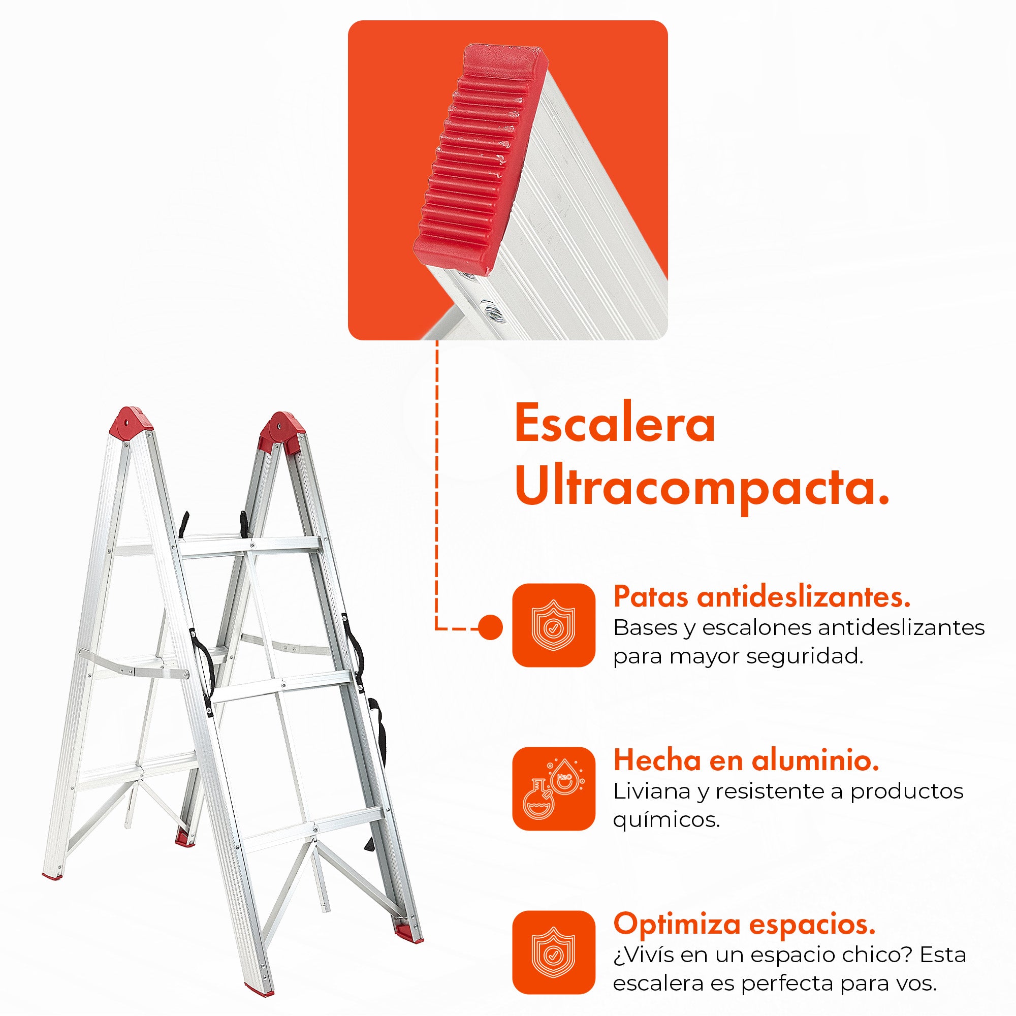 Chica, liviana y súper práctica. Esta escalera es ideal para tener a mano en casa. Se pliega fácilmente, ocupa muy poco espacio y su estructura de aluminio asegura estabilidad y durabilidad. Perfecta para alcanzar estantes altos sin complicaciones.