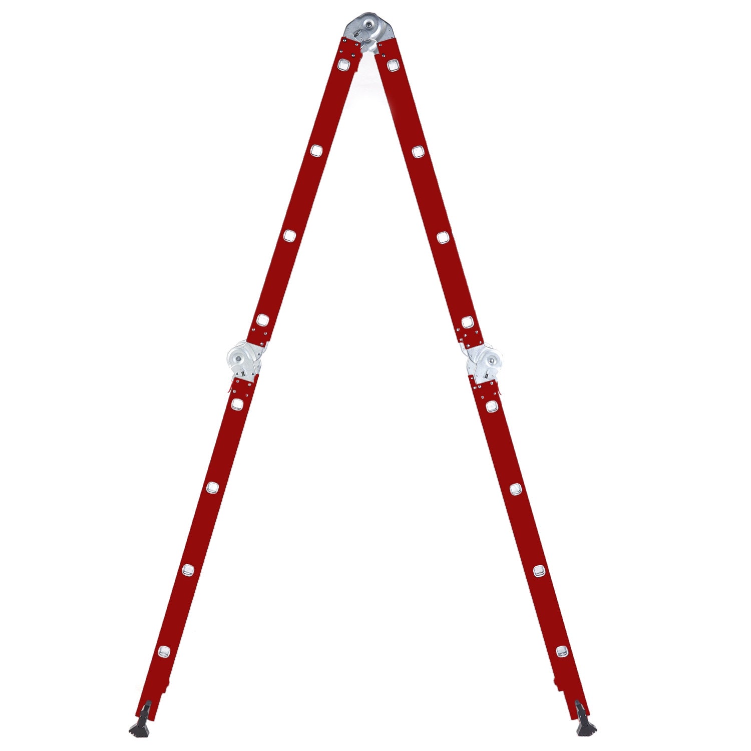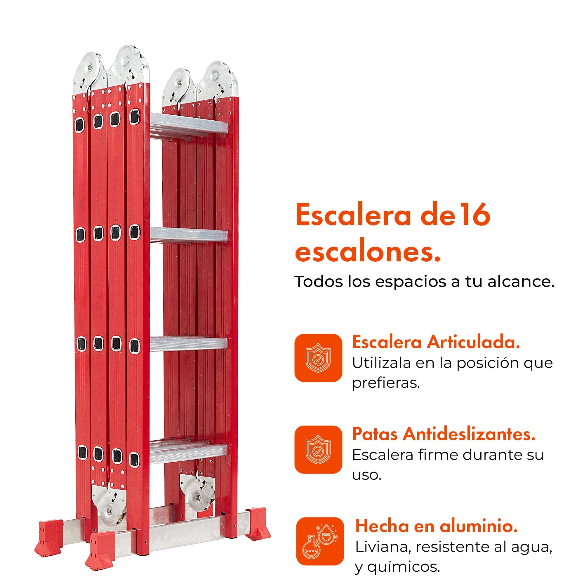 Una solución todo en uno para trabajos versátiles. Esta escalera articulada cuenta con 16 escalones distribuidos en 4 tramos, permitiendo configuraciones múltiples: tijera, extensión o andamio. Su estructura de aluminio combina ligereza con gran resistencia, mientras que su diseño Red Edition aporta un toque moderno y distintivo.