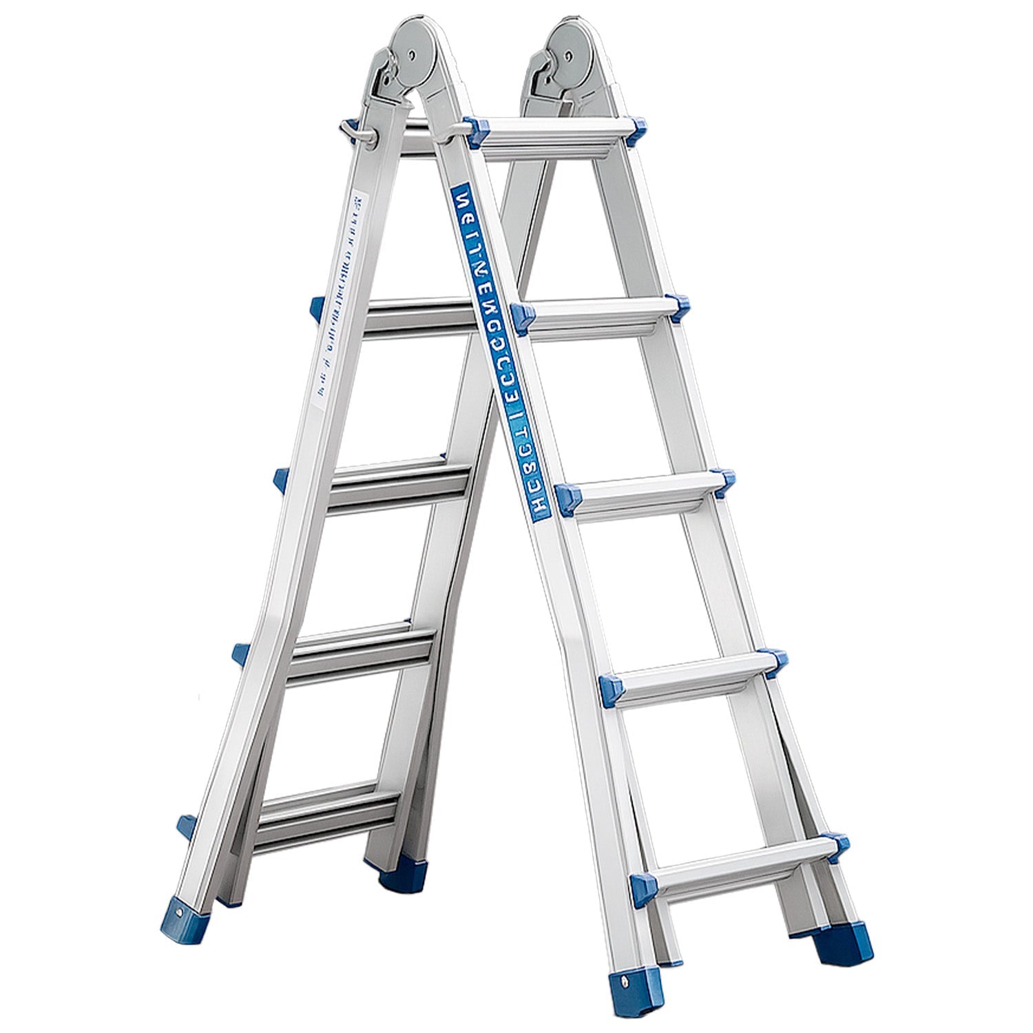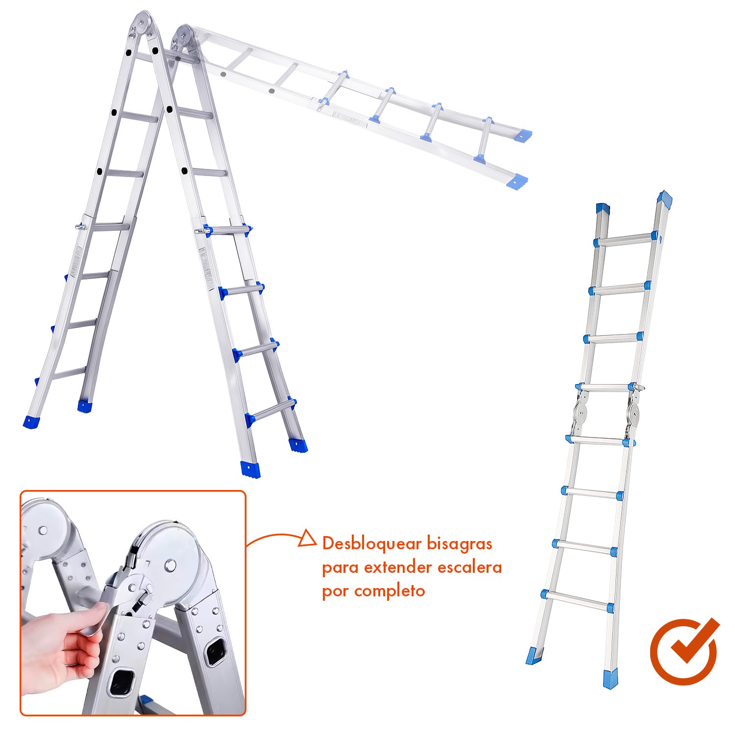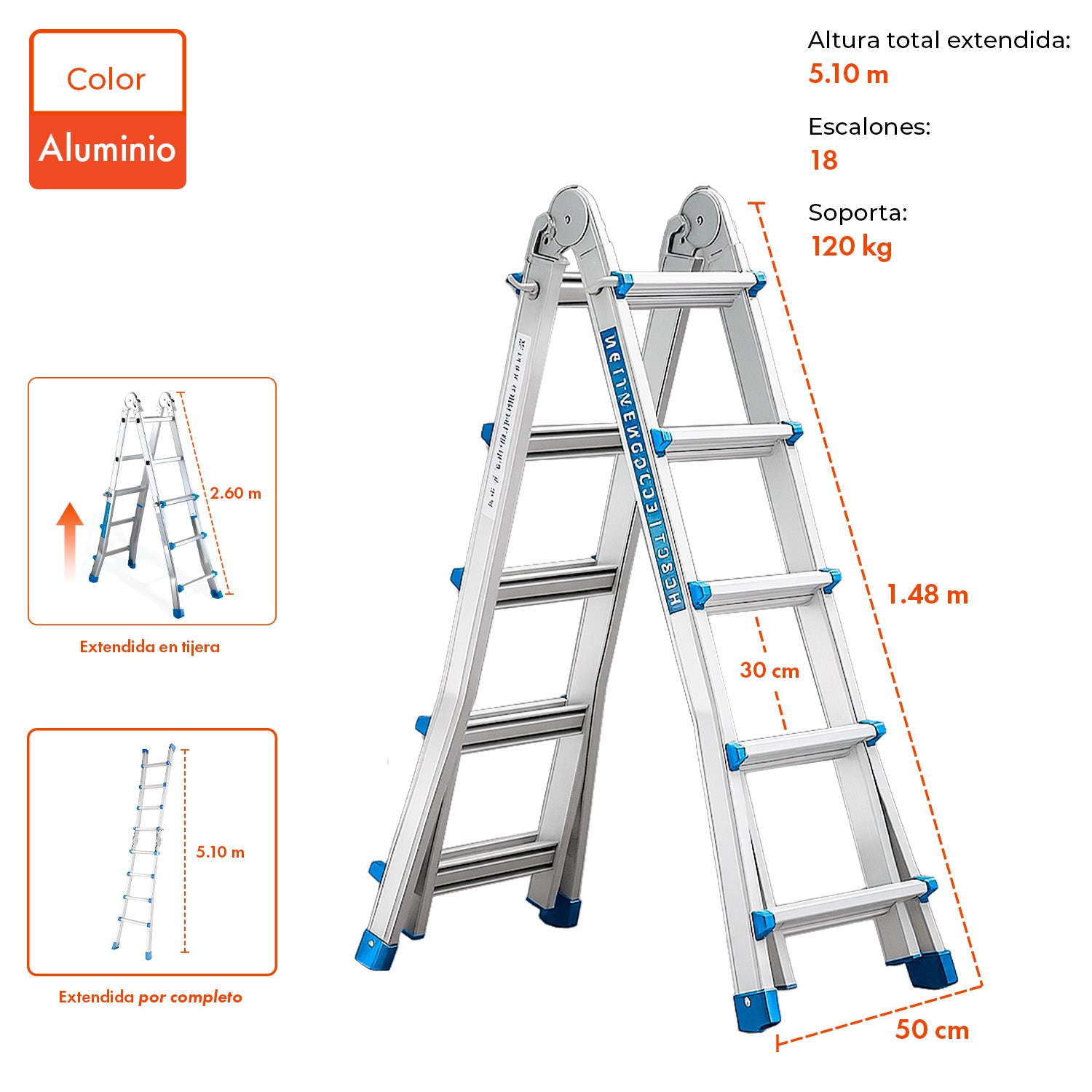 Escalera multifunción articulada de aluminio con 18 escalones, perfecta para alcanzar alturas de hasta 5.10 m. Su diseño extensible y plegable permite usarla en múltiples configuraciones: escalera recta, tijera o andamio. Ligera (alrededor de 13 kg) y con detalles antideslizantes y de seguridad. Una herramienta versátil, resistente y estética para uso doméstico o profesional