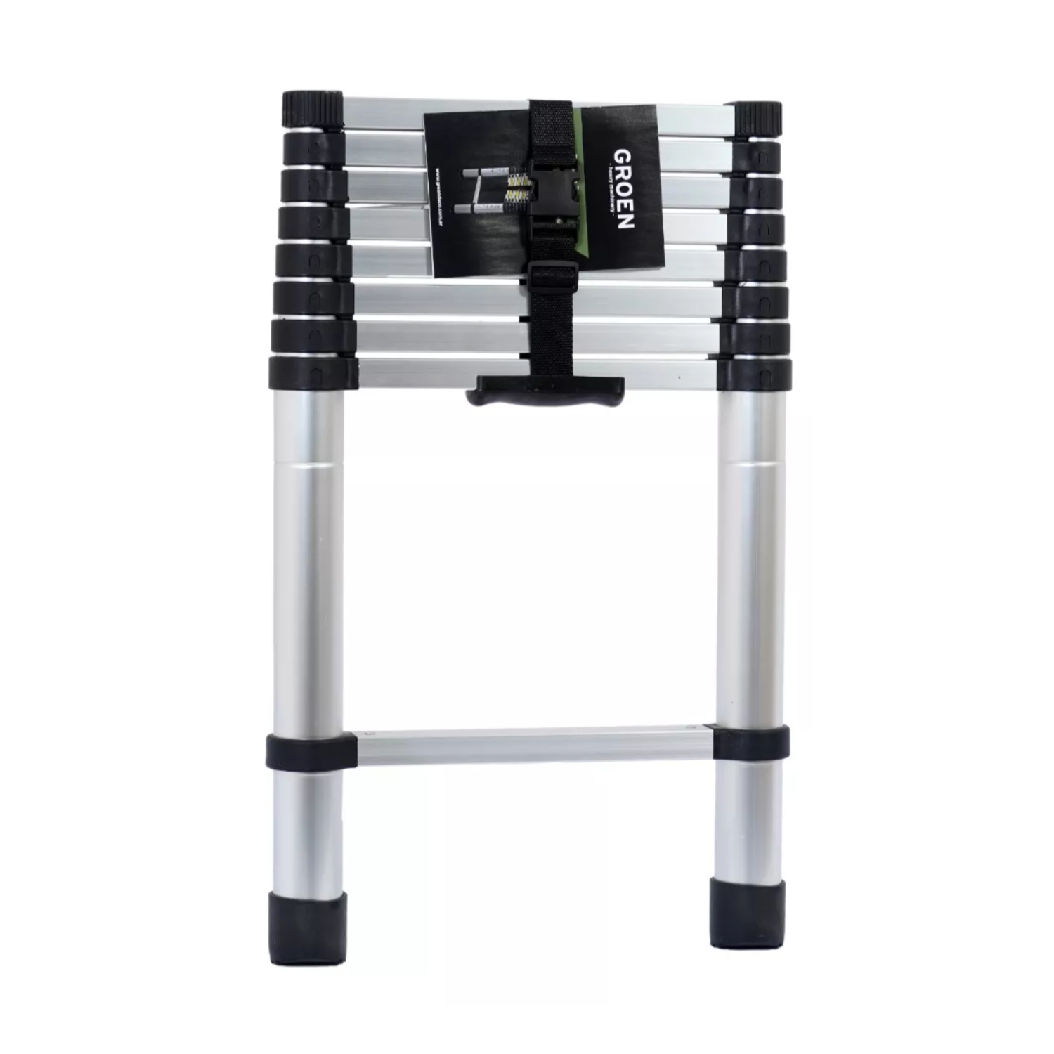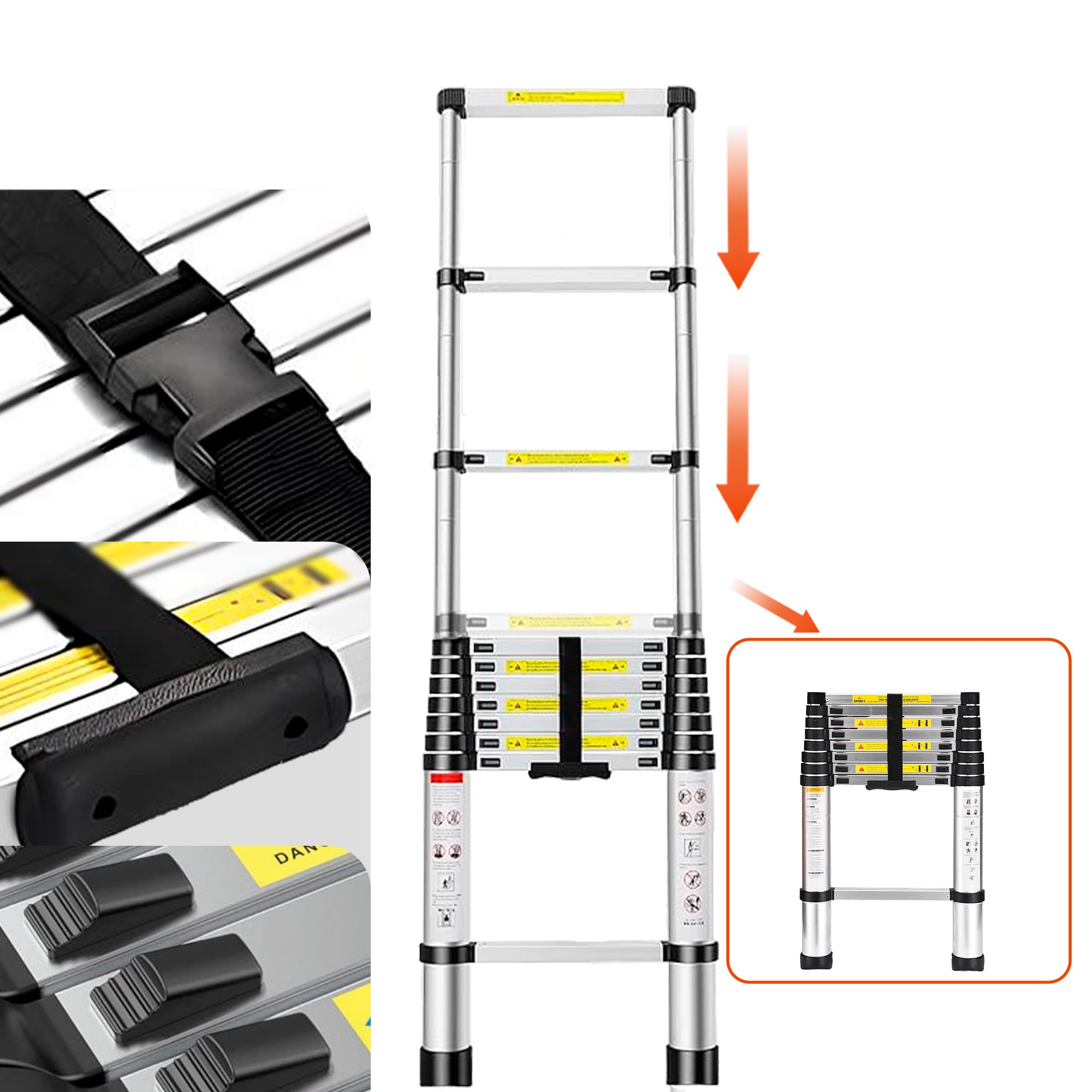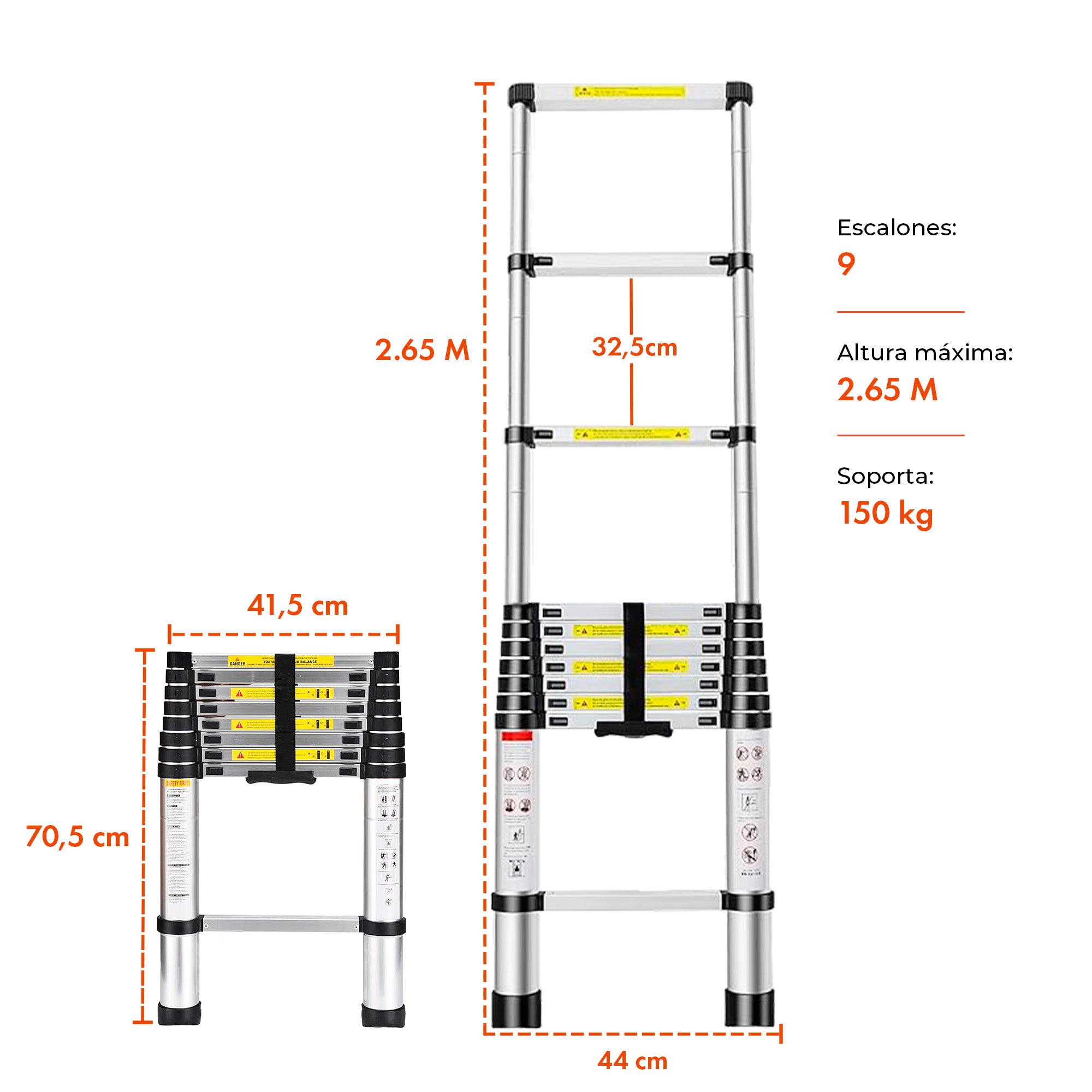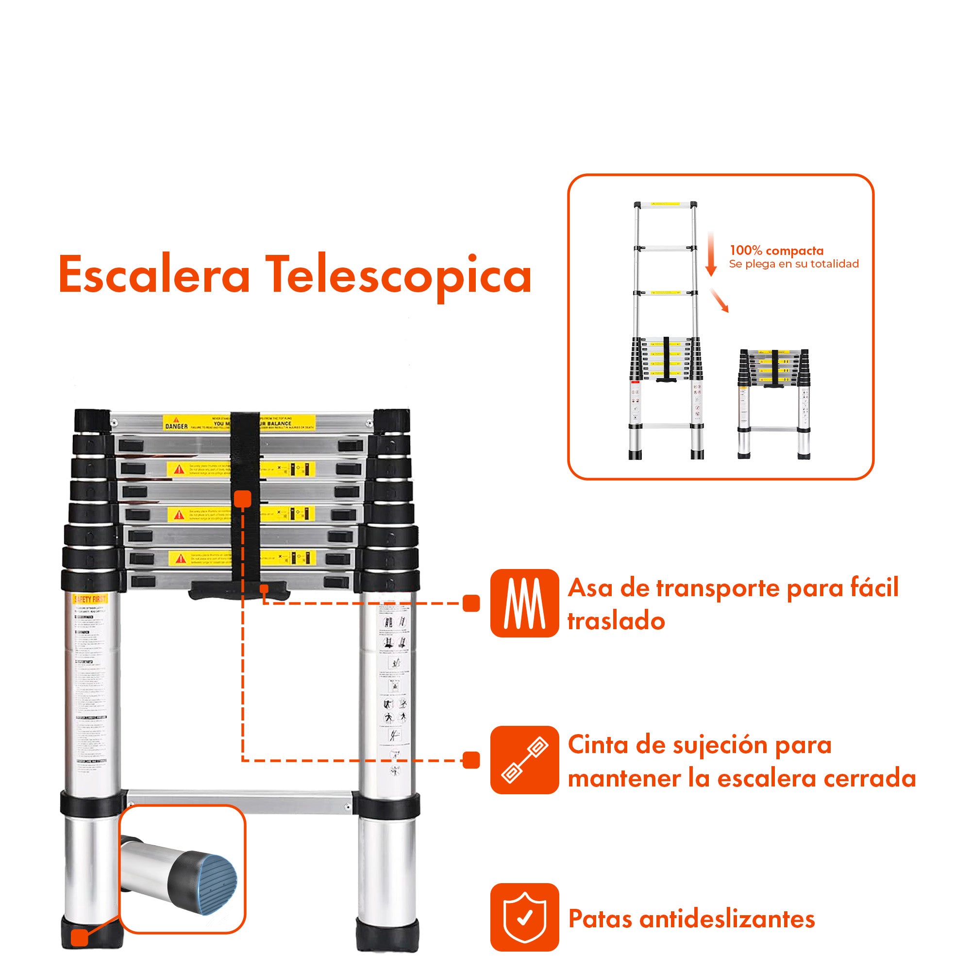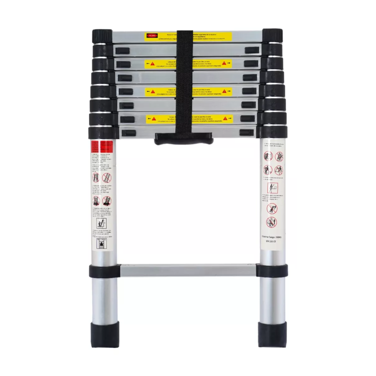 Práctica, segura y fácil de guardar, esta escalera telescópica alcanza hasta 2,6 metros y se pliega en segundos para un almacenamiento compacto. Ideal para trabajos en altura dentro y fuera del hogar, combina ligereza con resistencia, gracias a su estructura de aluminio y su sistema de bloqueo por tramos.