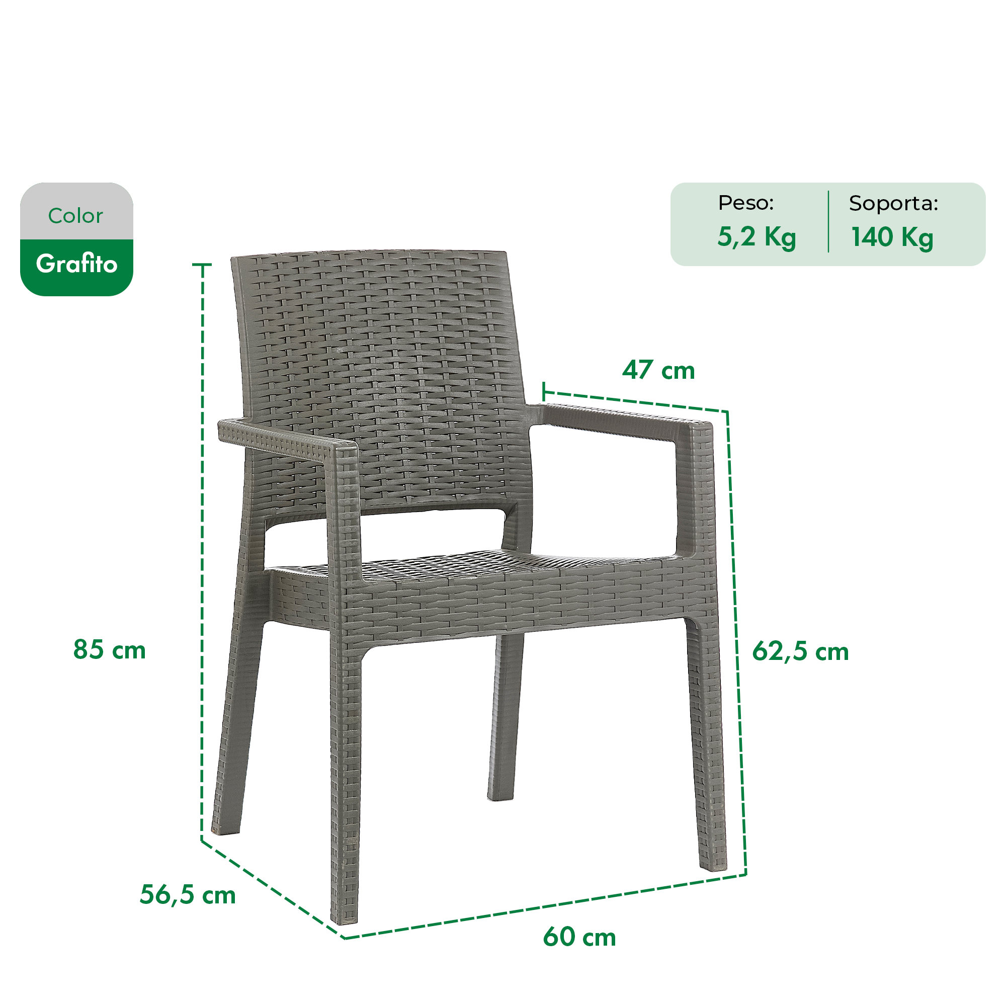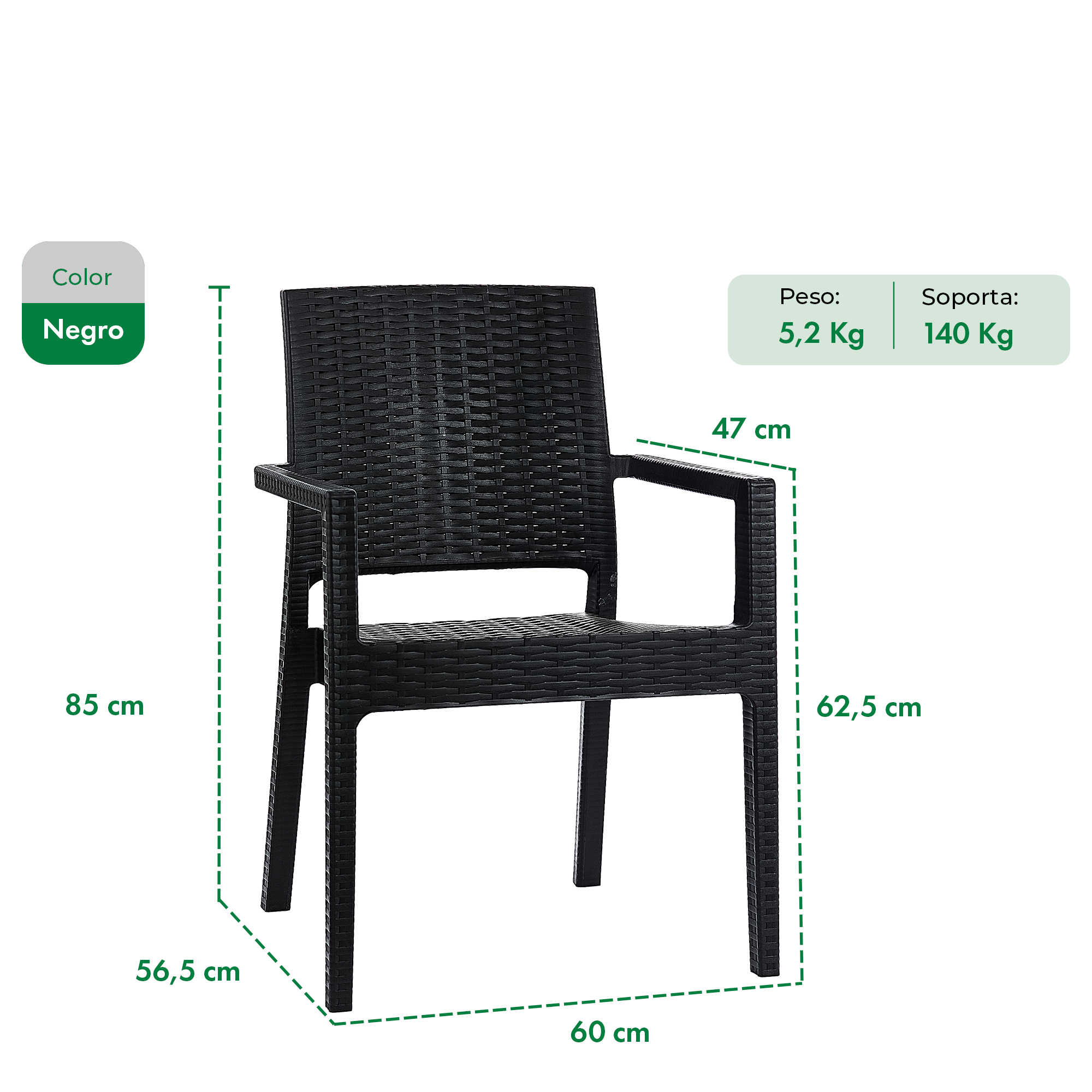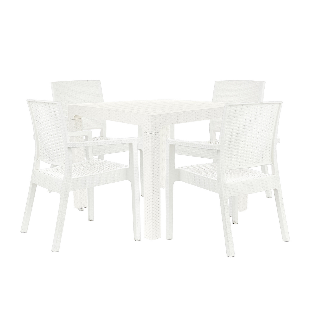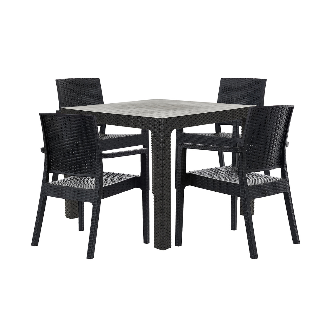 Elegancia funcional para tu jardín o terraza. Mesa cuadrada de rattan sintético (90x90 cm) y cuatro sillones Milano apilables, de líneas limpias y diseño liviano. Ideal para disfrutar al aire libre con estilo y practicidad.