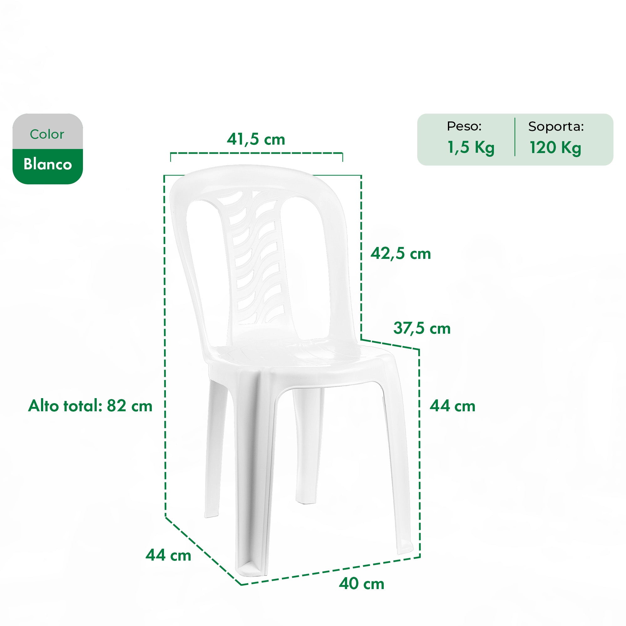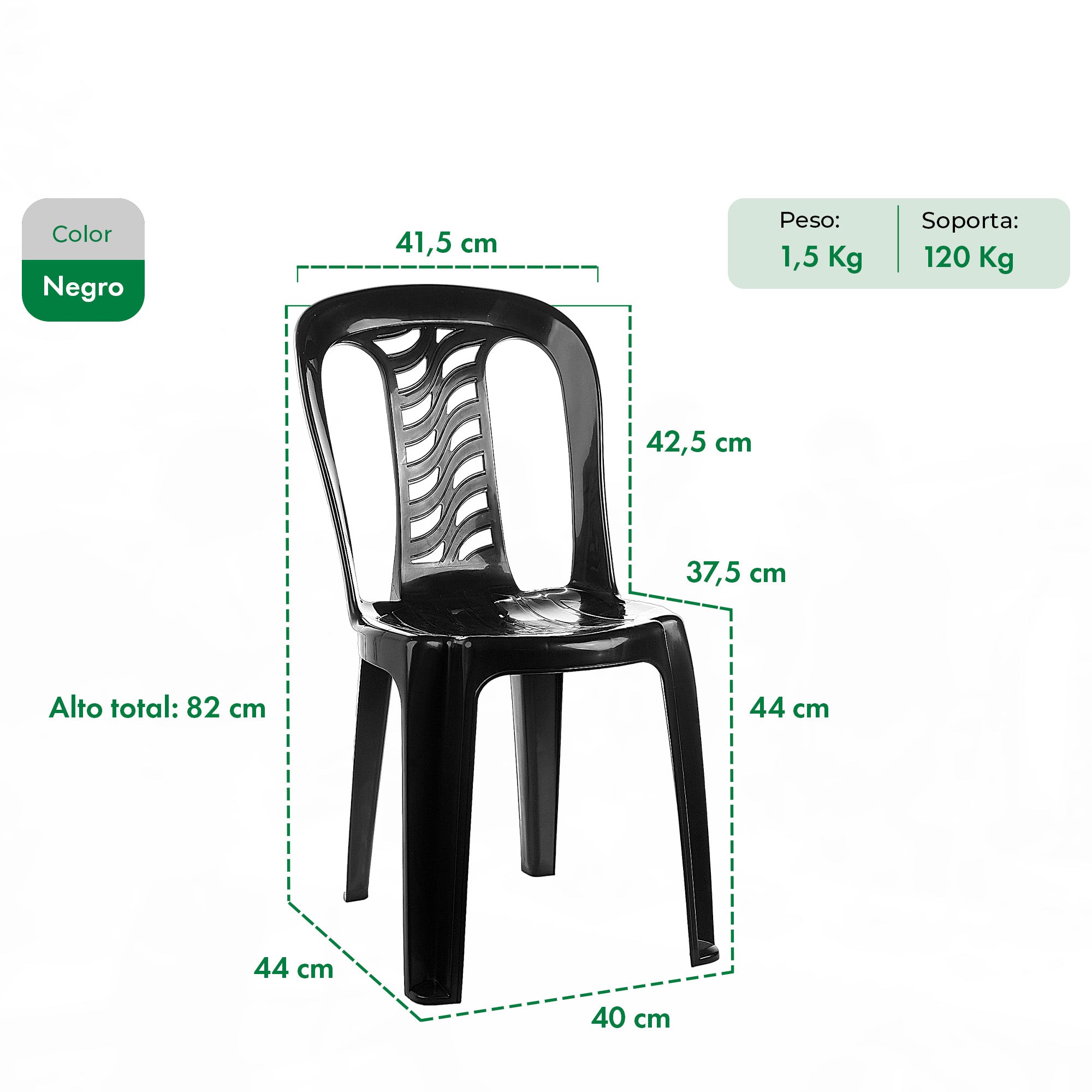Diseño clásico y funcional, ideal para interiores o exteriores. Fabricada en plástico resistente con estructura reforzada, es liviana, apilable y fácil de limpiar. Perfecta para terrazas, patios, bares o comedores diarios.